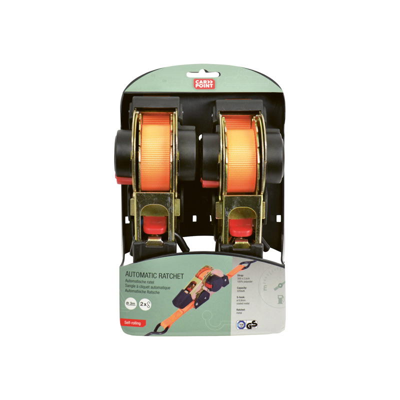 Deze Carpoint automatische spanband met haken is het ideale hulpmiddel bij transport of opslag van goederen. Met deze bagagebinder zet u ladingen stevig vast waardoor u voorkomt dat de lading gaat schuiven. Nooit meer last van losse uiteinden door het zelf oprollende mechanisme. De Carpoint spanband heeft een lengte van 3 meter en een breedte van 25mm. De spanband is maximaal belastbaar tot 325 kilogram. De S- vormige haken zijn voorzien van een coating waardoor beschadigingen worden voorkomen. De automatische spanband wordt per twee stuks geleverd en heeft het TÜV/GS keurmerk.