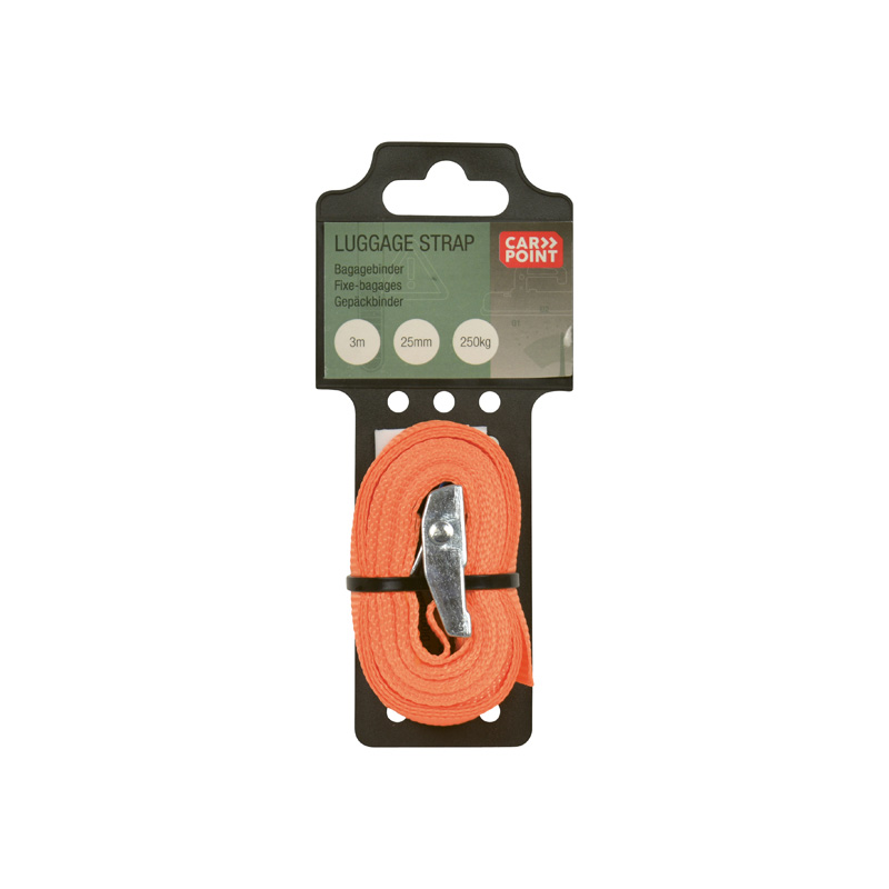 Met de Carpoint spanband zet u zware ladingen stevig vast waardoor u voorkomt dat de lading gaat schuiven. De bagagebinder is te gebruiken om lading op een aanhanger vast te zetten, maar is ook geschikt om te voorkomen dat een koffer open gaat. De Carpoint spanband heeft een breedte van 25 mm en een lengte van 3 meter. Voorzien van een klemsluiting, deze sluiting zorgt ervoor dat er voldoende kracht gezet kan worden om de sjorband aan te spannen, zonder dat deze losschiet. Door de sluiting in te drukken ontgrendeld de klem. TUV/GS keurmerk en geschikt voor ladingen tot maximaal 250 kg.