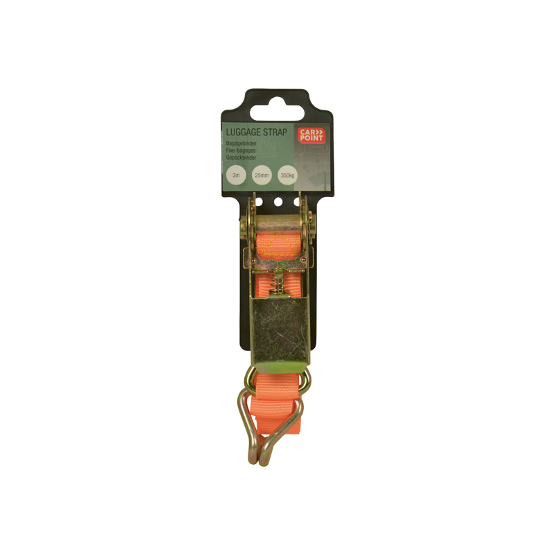 De Carpoint spanband met ratel is het ideale hulpmiddel bij transport of opslag van goederen. Met deze band zet u zware ladingen stevig vast waardoor u voorkomt dat de lading gaat schuiven. De bagagebinder is ook te gebruiken voor het vastzetten van motoren, andere grote voorwerpen of om iets te fixeren. De Carpoint spanband heeft een lengte van 3 meter en een breedte van 25mm en heeft aan beide kanten een haak. Hiermee kunt u de spanband snel en eenvoudig bevestigen. Met de ratel spant u de band makkelijk zonder dat u zelf veel kracht hoeft te gebruiken. Hierbij is het wel belangrijk dat u de spanband niet te strak spant zodat er beschadigingen kunnen ontstaan. De spanband is maximaal belastbaar tot 350 kilogram. De spanband met ratel wordt per stuk geleverd en heeft het TÜV/GS keurmerk.
