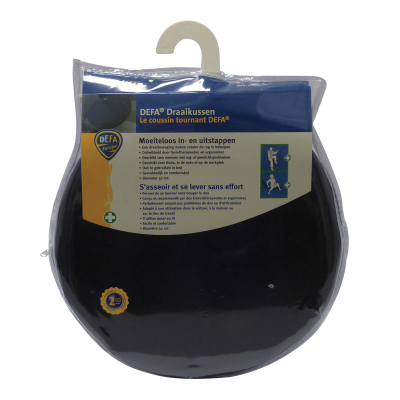 DEFA Draaikussen Het DEFA Draaikussen is speciaal door fysio- en ergotherapeuten ontwikkeld en biedt u de mogelijkheid om, zonder beweging van de rug, toch een draaibeweging te maken. Onder meer bij het in- en uitstappen uit de auto. Ideaal voor mensen met rug-, arm- of gewrichtsproblemen. - Draaien zonder inspanning - Past vrijwel overal (autostoel, bureaustoel, bed e.d.) - Gemakkelijk en comfortabel - Verkrijgbaar in de kleur zwart - Verkrijgbaar in Ø 32cm & Ø 40cm
