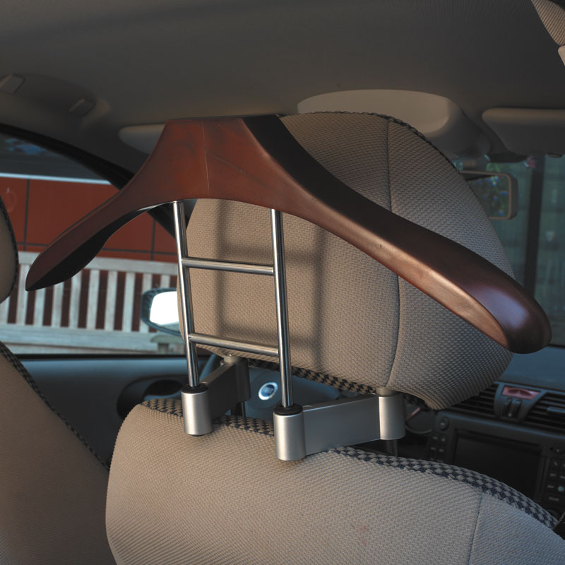Stabiele en exclusief ogende kledinghanger die d.m.v. bussen vastgezet wordt aan de stangen van de hoofdsteun.