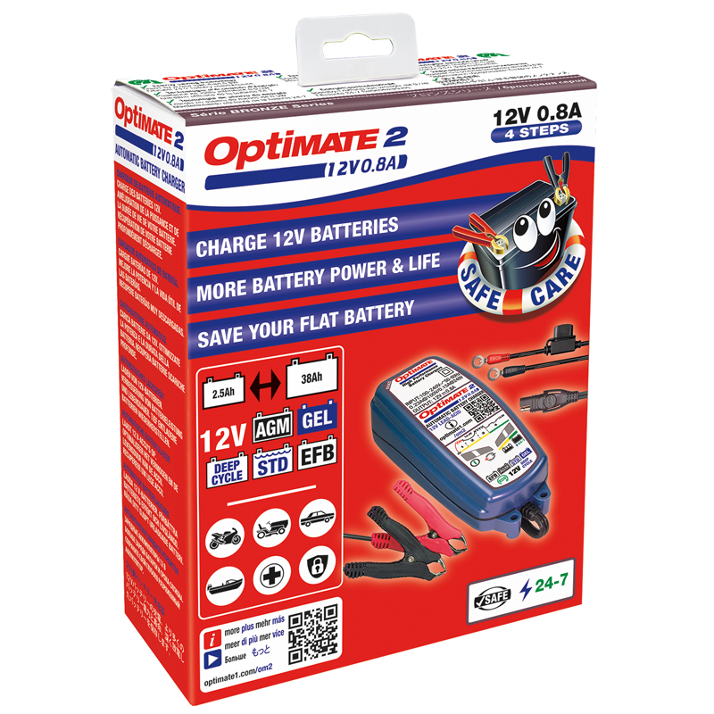 OptiMate 2 verlengt de levensduur en verbetert de prestaties van een 12V accu, gemonteerd in een voertuig/vaartuig of een systeem op batterijen dat niet dagelijks wordt gebruikt, zelfs bij temperaturen onder het vriespunt.