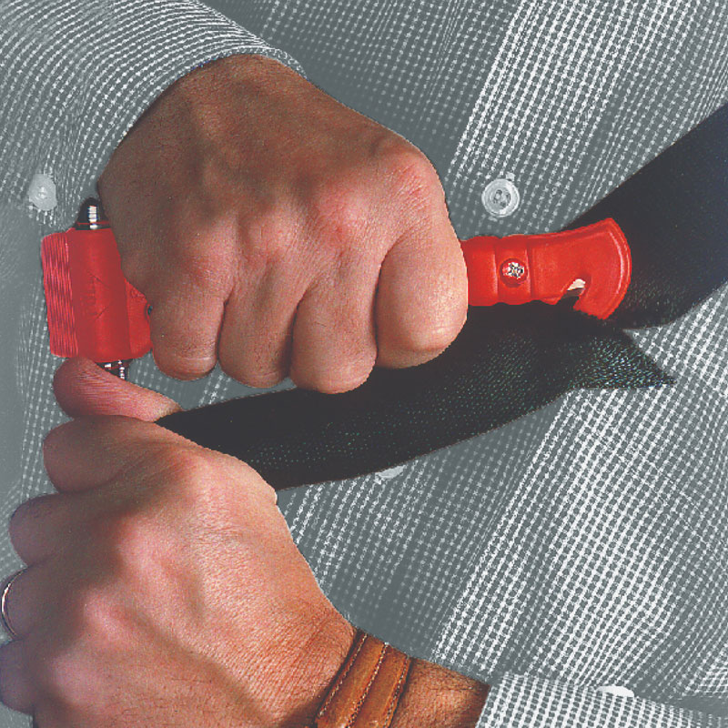 Dubbele hamer met geharde punten om ramen in enkele seconden te verbrijzelen. Ingebouwd, vlijmscherp Solingen mes voor het doorsnijden van gordels. Fluorescerende knop om de LifeHammer in het donker te vinden. Met schakelaar om misbruik te voorkomen.