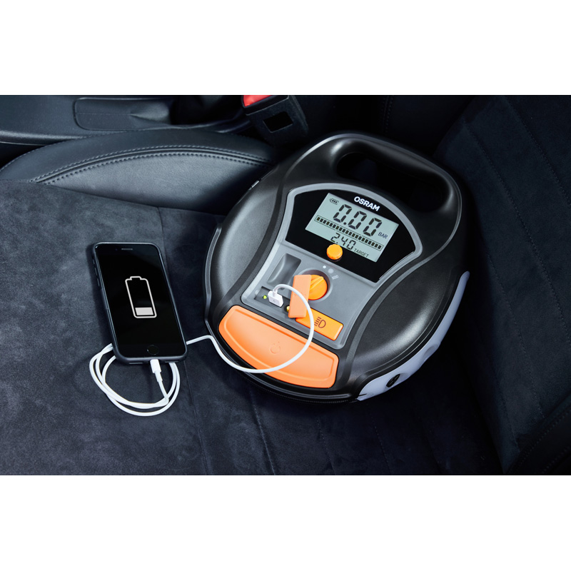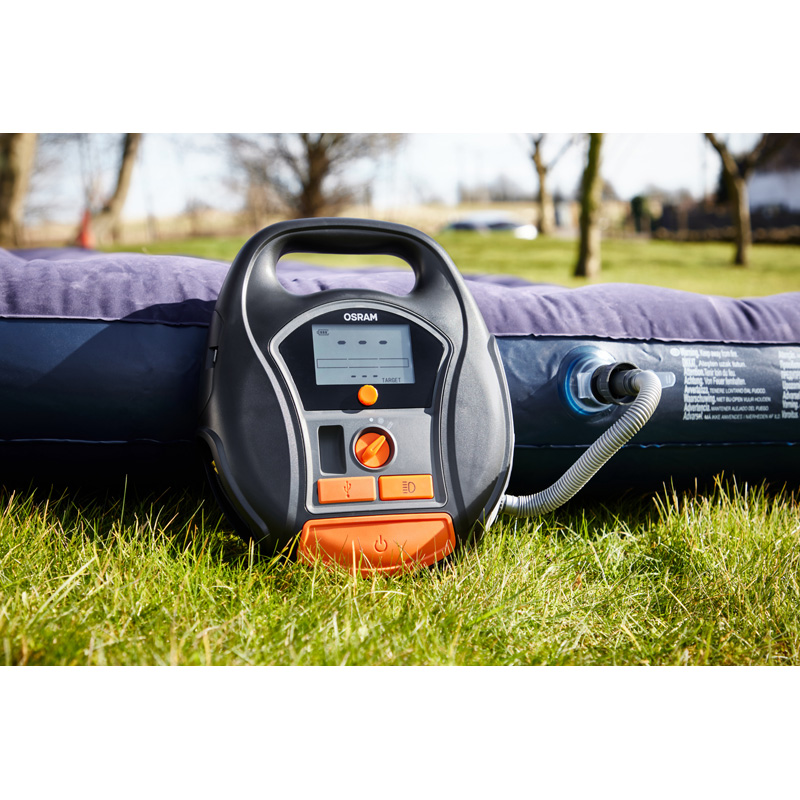 De OSRAM TYREinflate 6000 is een draadloos en oplaadbaar bandenopblaassysteem met Li-Ion batterij, waardoor het een ideale metgezel is voor kamperen en autoritten. De OTIR 6000 digitale bandenpomp kan een band in slechts twee minuten oppompen en heeft een speciale instelling voor andere opblaasbare artikelen zoals luchtbedden, luchtmatrassen, ballen en meer. De automatische stopfunctie en het ontluchtingsventiel helpen de banden en andere opblaasartikelen optimaal op spanning te houden. Het LED-display met achtergrondverlichting en de geïntegreerde LED-lamp zorgen voor een betere leesbaarheid van de drukinstellingen en een betere verlichting van het werkgebied, zelfs bij slecht zicht of 's nachts. Dankzij de powerbankfunctie kan de OSRAM TYREinflate 6000 ook worden gebruikt als oplader voor elektronische apparaten zoals uw mobiele telefoon. De levering omvat een netoplader en een 12-volt kabel voor directe stroomvoorziening, indien nodig. Ook inbegrepen zijn een 10-delige adapterset, een opbergtas en reserve ventieldopjes.