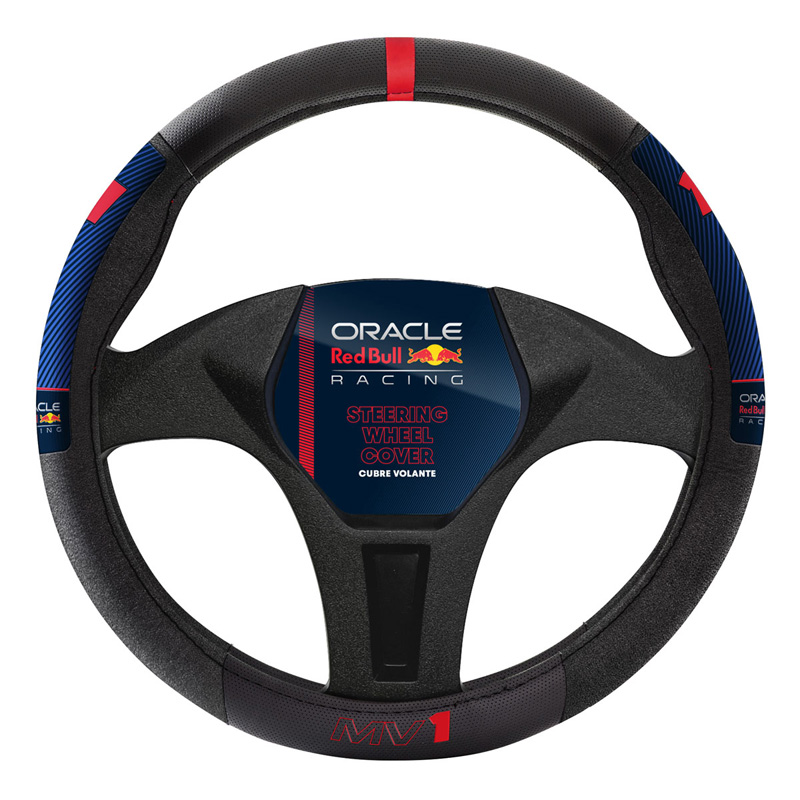 Red Bull Oracle Universele stuurwielhoes - Type 02 MV1 - Zwart/Rood/Blauw - Officieel Red Bull Oracle gelicentieerd product - Met 'MV1' Max Verstappen logo - Steun je favoriete F1-team - Universele pasvorm - 100% PU