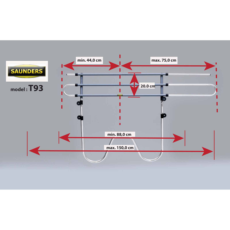 Het rek is volledig verstelbaar in zowel breedte als hoogte. Het W-frame heeft een minimale hoogte van 48cm, maar middels de traploos instelbare poten kan het worden ingesteld tot 80cm. Het rek kan na montage eenvoudig verwijderd worden door enkel de gespen te ontgrendelen.