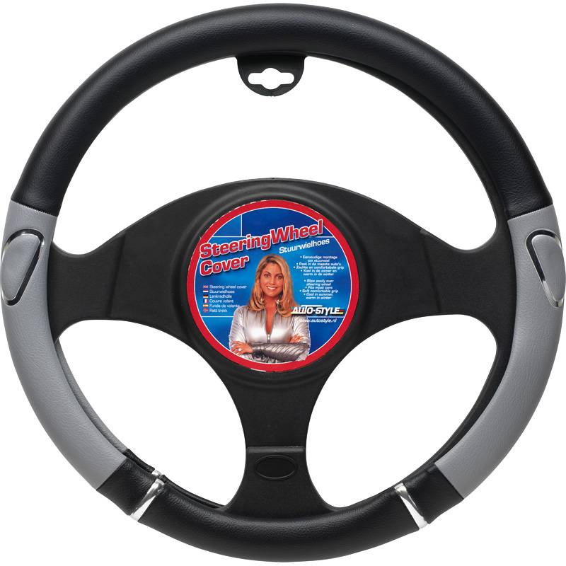 Universele stuurwielhoes voor je originele stuurwiel. Kleuren zwart/grijs/chroom. Eenvoudig te monteren. Zachte en comfortabele grip.